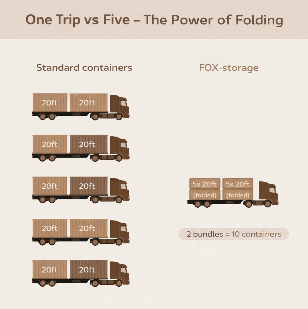 When folded, FOX units stack into compact bundles, allowing significantly more containers to be transported within the same transport capacity.